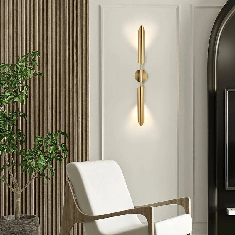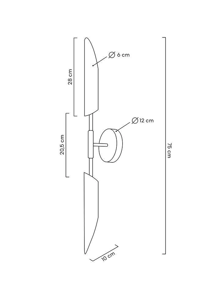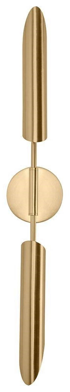 MOOSEE lampa ścienna LOCCA złota. Wykonana w całości ze stali w kolorze złotym. Podłużne klosze z dwóch stron oprawy skrywają źródło światła. Elegancki kinkiet z pewnością odnajdzie się w nowoczesnych aranżacjach. Światło: 2 x G9 max. 40 W (brak w zestawie) Oprawa: wys. 75 cm / szer. 12 cm / gł. 10 cm Klosz: wys. 28 cm / śr. 6 cm Mocowanie: śr. 12 cm / gł. 2,5 cm Elementy łączeniowe: dł. 2,5 cm / dł. 20,5 cm Montaż: instalacja sufitowa Waga netto: 1kg Wymiary opakowania: 86 cm / 15 cm / 17 cm.