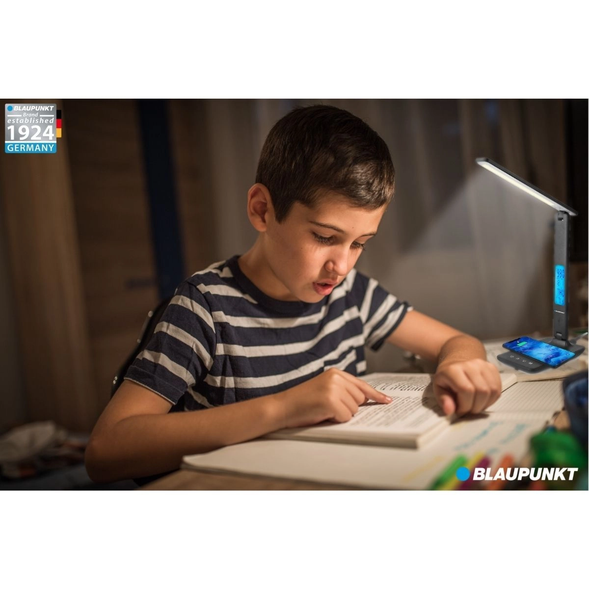 Posiada ekran lsd z możliwością wyświetlania daty, bezprzewodową ładowarkę do telefonu z możliwością ładowania bezprzewodowego przez położenie go na spód lampy.
