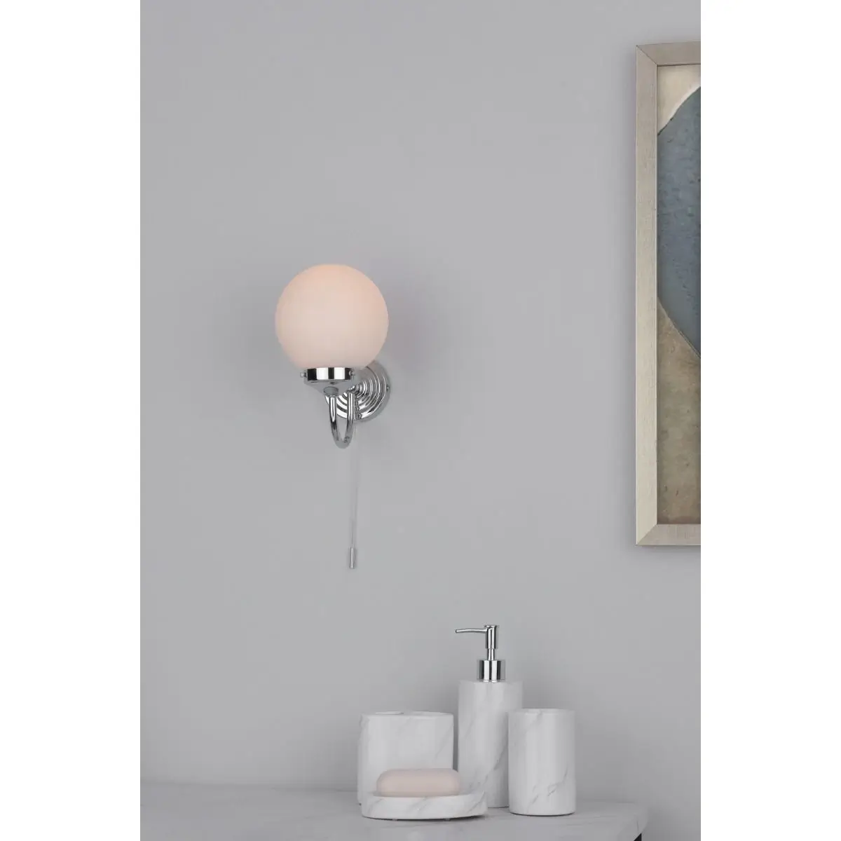 Łazienkowy kinkiet ścienny Barclay BAR0750 szklany kula biała chrom w MLAMP łączy w sobie wyjątkowy i ponadczasowy design w najlepszym wydaniu, co stwarza szereg możliwości aranżacji przestrzeni w Twoim Domu. Oświetlenie z łatwością wkomponuje się w pomieszczenia o klasycznym i nowoczesnym klimacie.